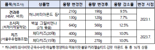 한국소비자원에서 슈링크플레이션 제품들을 조사한 결과를 발표했다. 한국소비자원에서 운영하는 참가격 사이트에서는 대형마트, 슈퍼마켓, 백화점, 전통시장과 편의점까지 가격 정보를 비교해 볼 수 있다. 이 참가격 내 가공식품 209개를 조사한 결과, 19개 상품의 용량이 최소 7.7%~최대 12.5%까지 줄어든 것으로 나타났다. 대표적으로 바프 허니버터아몬드, 씨제이 제일제당의 그릴 비엔나소시지, 서울우유의 체다치즈 등이 내용물을 줄였다. 이중 허니버터아몬드의 경우 자사몰을 통해 용량변경사실을 알렸다.