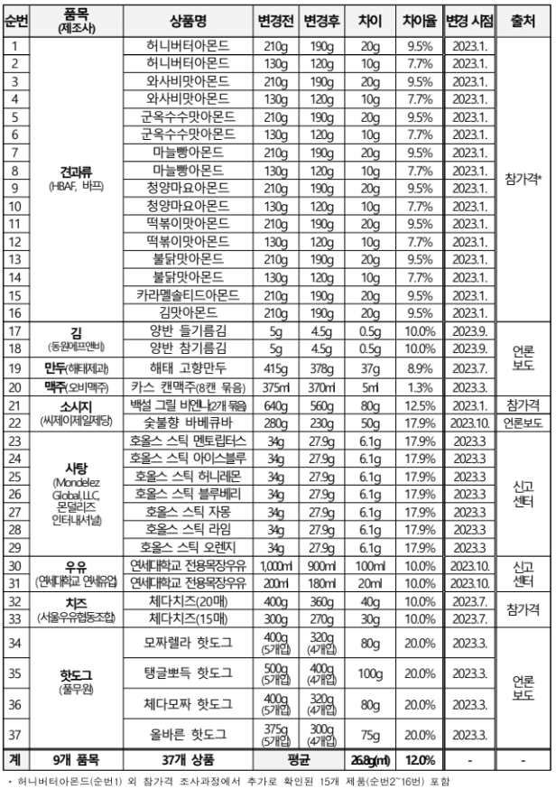 마지막으로 언론을 통해 슈링크플레이션이 있었다고 보도된 식품 10개를 추가로 조사한 결과, 이중 9개 식품의 용량이 줄어든 것으로 확인되었다.