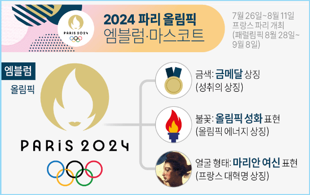 이번 파리 올림픽의 엠블럼은 골드 컬러, 올림픽 불꽃과 프랑스의 상징인 마리안느(Marianne) 이 세 가지를 통합했다. 금색 바탕의 타오르는 불꽃 같은 마리안느의 얼굴을 표현했으며, 금색은 금메달, 불꽃은 올림픽 성화를 나타낸다. 마리안느는 프랑스혁명을 상징하는 인물로, 1789년 프랑스혁명 이후 자유·평등·박애를 중요시하는 프랑스의 가치를 함축적으로 나타내는 인물이다.