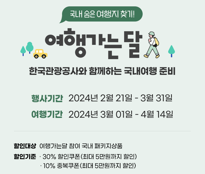 한국관광공사에서 3월을 "로컬 재발견"이라는 슬로건으로 여행 가는 달 캠페인을 진행한다. 지마켓 프로모션으로 지역여행상품들을 최대 40%까지 할인받을 수 있는 쿠폰을 제공한다. 3월 여행을 계획하고 계시다면 꼭 쿠폰 받고 여행하시기 바란다.